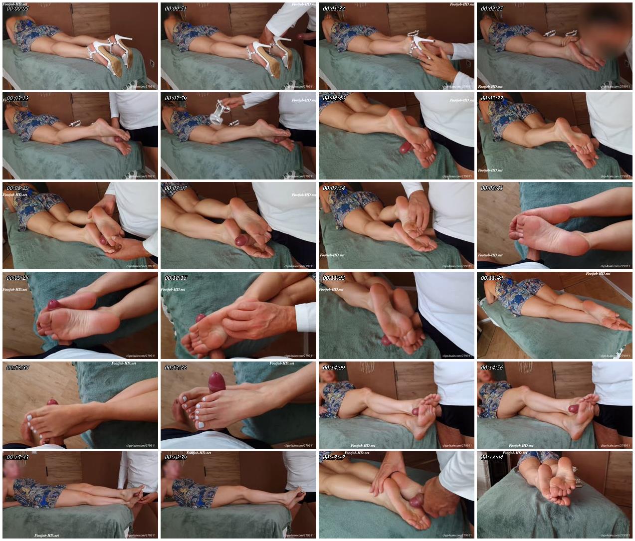 Guys, I have to tell you about Erica. She’s a dance teacher who came to my studio to have some portrait photos taken. She’s a blonde in her thirties, elegant, wearing a dress and white pumps. You could see her beautifully shaped feet. The photo shoot was relaxed, we laughed a lot. We talked about her profession, and I joked that I would like to take Latin lessons from her. She took it with a smile. Then I asked her if her feet hurt from dancing. She said yes. She admitted that she was single. I told her that I would massage such beautiful feet every day. She smiled, and you could see that she was flattered. I added that I have a weakness for feet. She was surprised, but she reacted with curiosity because she had never experienced this with any partner before.I also mentioned my SFYC project and asked if she would like to get involved. She was surprised at first. I showed her samples of my work. I was thrilled to hear her say “yes.”However, she admitted that she would be nervous, even though she was curious. My cock got hard and stayed that way until the end. I prepared the massage table. Erika lay down on her stomach, I took off her high heels and lightly tickled her foot with the heel of her shoe. She flinched and started laughing. Her feet smelled good, so I had to bring my nose closer to them. I sniffed like crazy. I had the smell of sweat in my nose all day. I gently caressed them, and then let her massage my cock with her feet. At first hesitantly, then slowly and sensitively, she changed the tempo. Sometimes gently, sometimes faster. It was like a dance, only with her feet. She gave me a beautiful footjob and she was really good at it. I tickled her feet lightly and her laughter was contagious. Fans of tickling will enjoy this. She turned onto her back and continued the game. Her feet worked confidently, with the energy of a dancer. Her white nails looked elegant, and my fingers ran over her feet from heel to toe, tickling her. She laughed, wiggled her toes, and it was clear that she was enjoying it. The atmosphere in the room was electric, and I knew it was finally coming. I sprayed her wrinkled feet with my sperm, and she had sticky soles. She curled her toes beautifully, and my sperm slowly dripped between her toes. When it was over, Erika just smiled and said, “That was beautiful, and I want to make you come again. “At the end of the video, enjoy a slow-motion close-up of my cumshot, and for tickling lovers, I added a bonus of hard tickling of Erika’s feet.